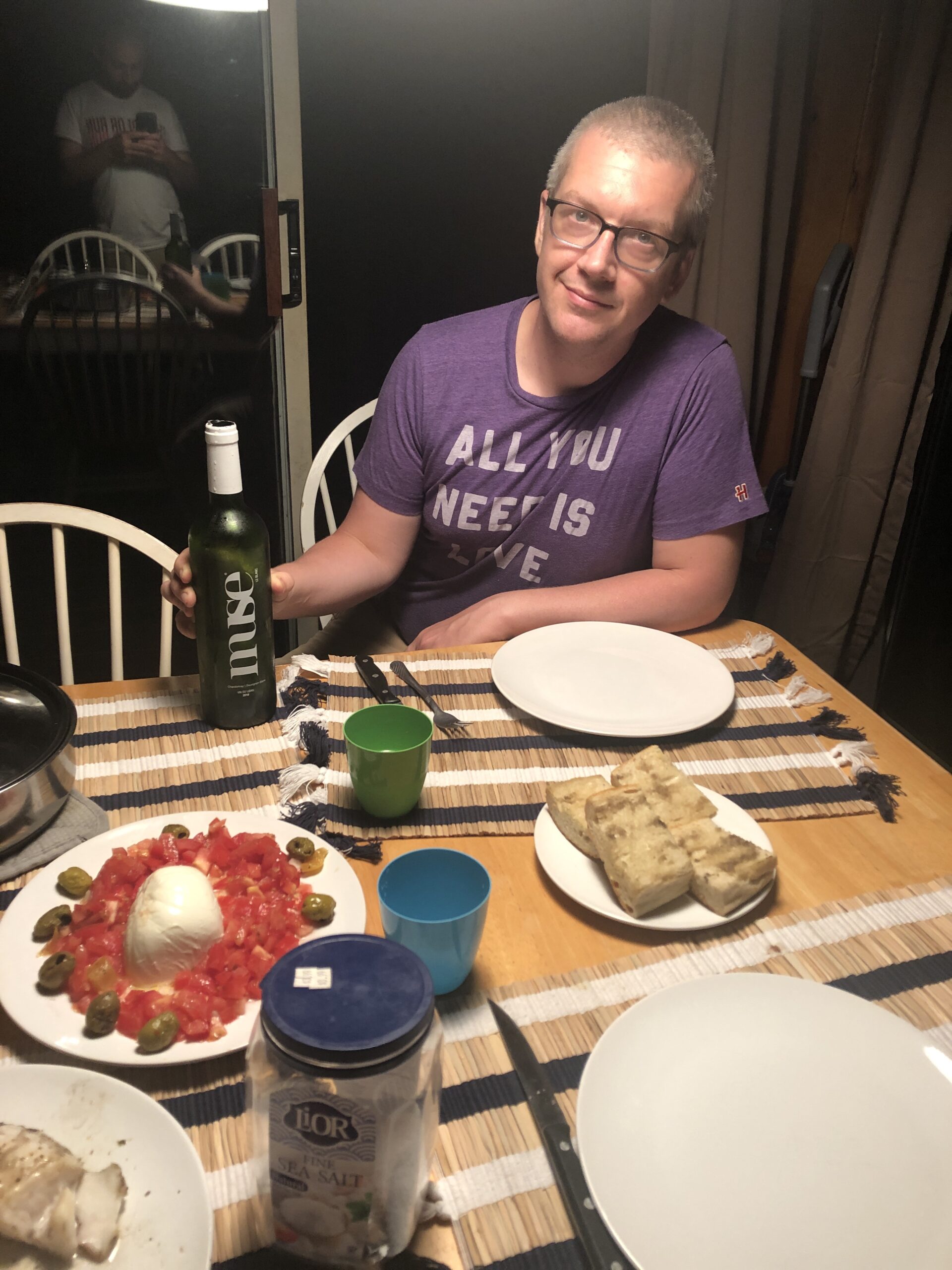 For dinner, Samer made the best pork chop I’ve ever had. He made a sauce from red wine, apple butter, and apple cider vinegar. We paired it with a Cabernet Sauvignon and finished the birthday cake. It was a fantastic meal.