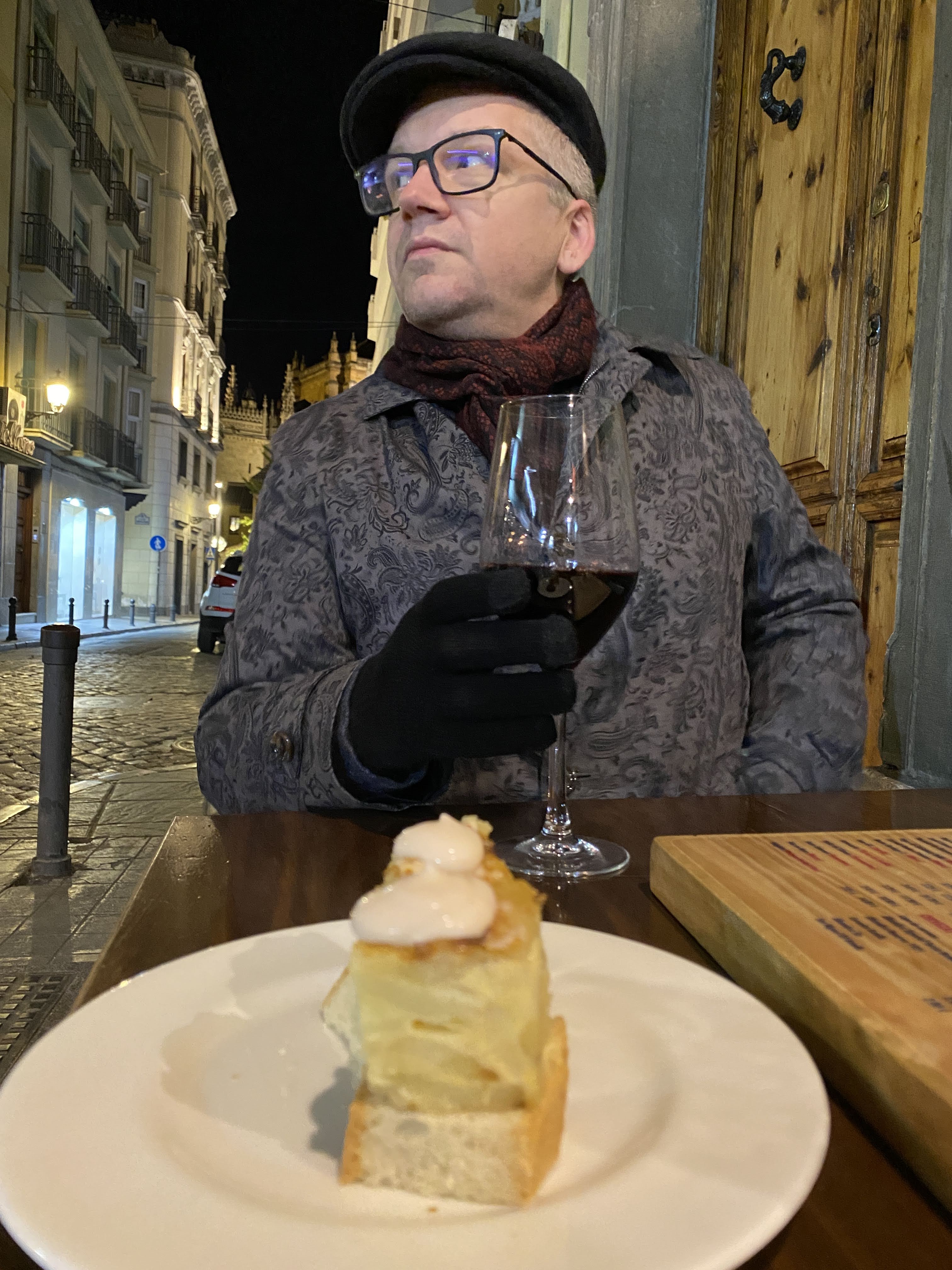 After lunch, we continued to explore Granada and took a small nap to manage jet lag. Afterward, we decided to roam the streets a bit more and grabbed a table at a place called La Vinoteca for a glass of wine and our first tortilla Espanol (potatoes and egg omelet).   Spain is famous for its tapas, and we were told Granada is the last place in the country where they still come free with a drink.    I don’t know if this is true, but there is a lot of complimentary food in this town.