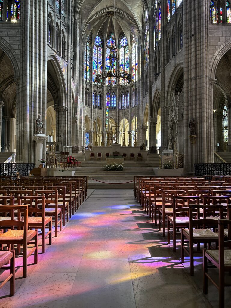 Saint-Denis is in the northern part of the city, and it is massive. It is still an active church and served as the royal necropolis housing the remains of over 40 French kings and queens. On that day, when we walked into the cathedral, it was away in rainbow colors. The son was very bright and shining through the stained glass windows, giving a kaleidoscopic effect to the main room. The Rayonnant rose window on the north side is breathtaking.